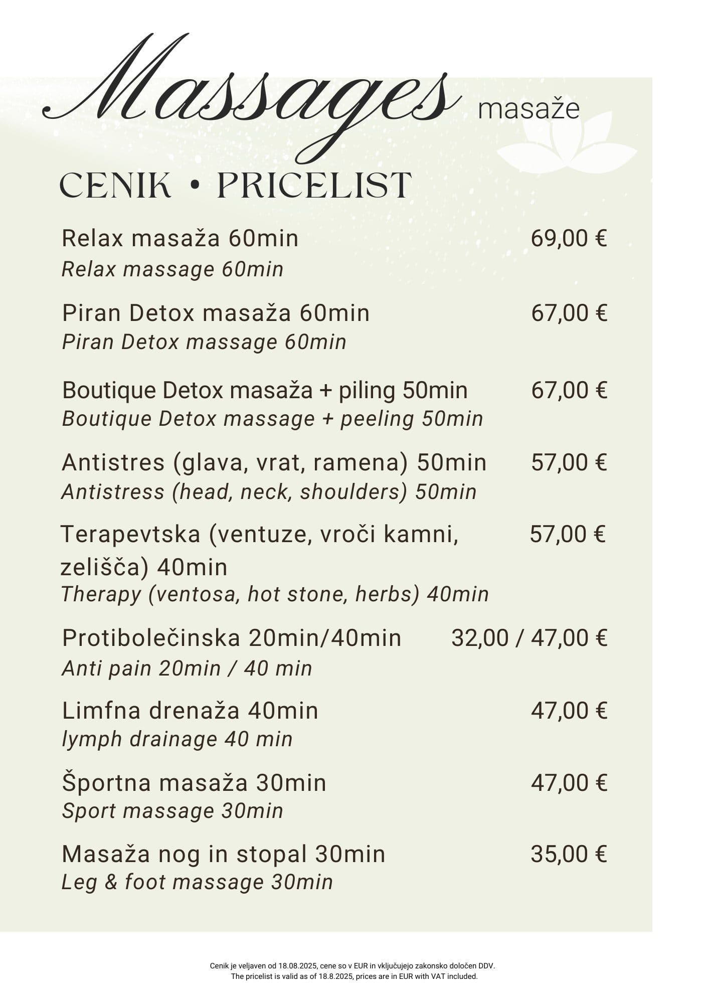 HOTEL PIRAN Wellness HOTEL PIRANWellness pricelistOpening Hours:Wednesday - Sunday: 13:00 - 20:00Inquiries and reservations: piran@eh.si